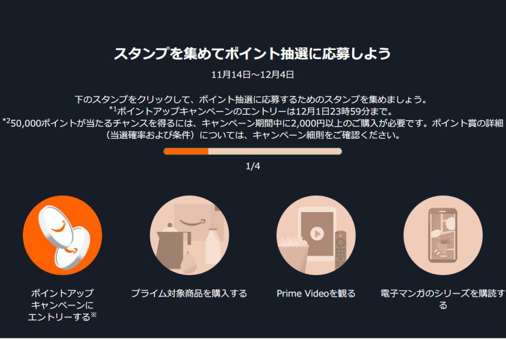 Amazonブラックフライデーでは、スタンプラリーに参加して条件を達成することでポイントがもらえる抽選に応募することができます。