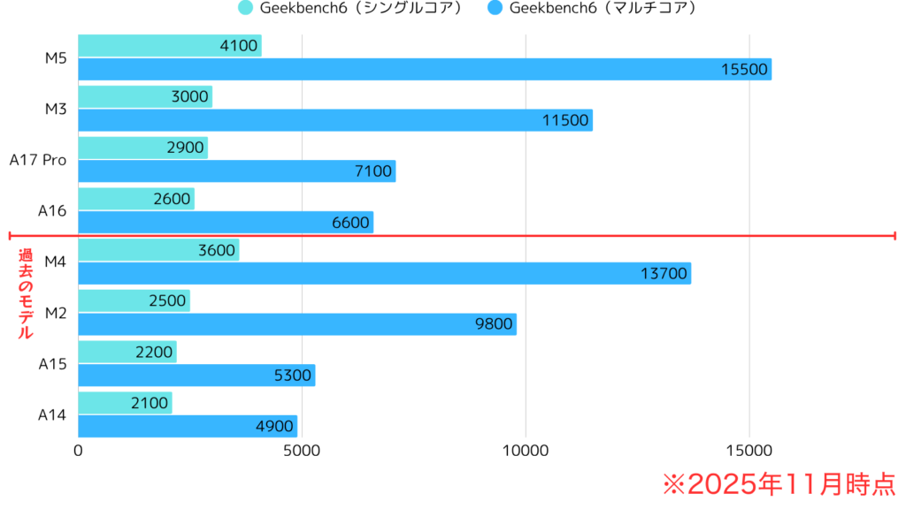 | Geekbench 6 マルチ (CPU性能) | 6600 | 7,100 | 11,500 | 11,500 | 15,500 | 15,500 |