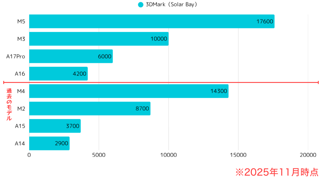 一方でiPad Airに搭載されているM3はマルチコア11,500、iPad Proに搭載されているM5はマルチコア15,500と、A17 Proと比べてもCPU性能が大幅に向上しています。