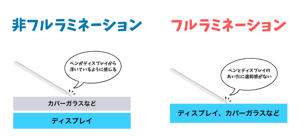 フルラミネーションは動画視聴やブラウジングなど日常的に使うぐらいなら問題ありませんが、イラストや勉強などペンを使うような用途では割と違いを感じる箇所です。