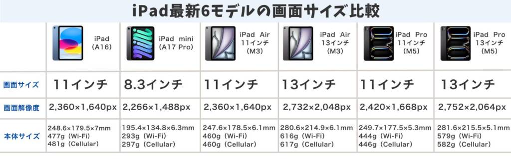 だいたいの用途であればiPad Air 13インチ(M3)か、iPad Pro 11インチ(M5)のほうがコスパ的にもいいです。