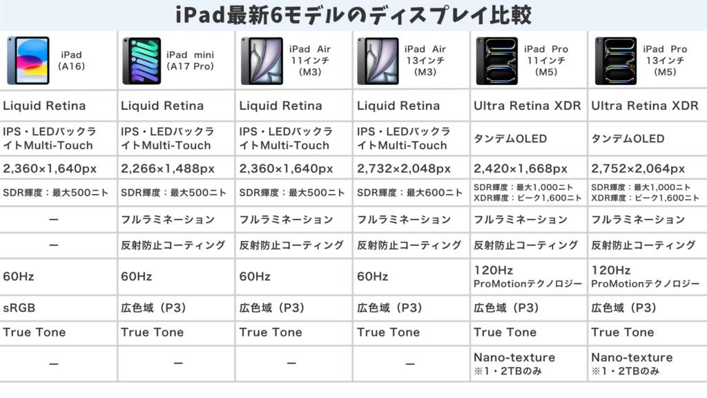 | ディスプレイ | ・11インチ ・Liquid Retinaディスプレイ ・True Toneディスプレイ | ・8.3インチ ・Liquid Retinaディスプレイ ・フルラミネーション加工 ・反射防止加工 ・True Toneディスプレイ | ・11インチ ・Liquid Retinaディスプレイ ・フルラミネーション加工 ・反射防止加工 ・True Toneディスプレイ | ・13インチ ・Liquid Retinaディスプレイ ・フルラミネーション加工 ・反射防止加工 ・True Toneディスプレイ | ・11インチ ・Ultra Retina XDRディスプレイ ・フルラミネーション加工 ・反射防止加工 ・True Toneディスプレイ ・ProMotionテクノロジー ・タンデムOLED ・Nano-textureディスプレイ(1,2TBのみ) | ・13インチ ・Ultra Retina XDRディスプレイ ・フルラミネーション加工 ・反射防止加工 ・True Toneディスプレイ ・ProMotionテクノロジー ・タンデムOLED ・Nano-textureディスプレイ(1,2TBのみ) |