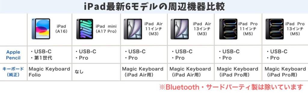 | 対応キーボード (Bluetoothは除く) | Magic Keyboard Folio | なし | ・Magic Keyboard | ・Magic Keyboard | ・専用Magic Keyboard | ・専用Magic Keyboard |