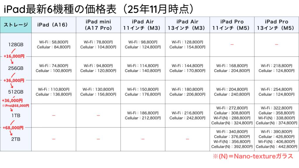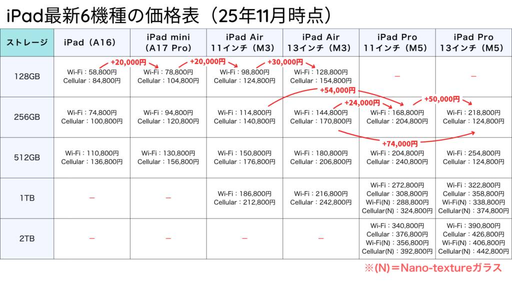 無印iPadからiPad Air 11インチまでの価格差はそれぞれ20,000円、iPad Air 11インチと13インチでの価格差は30,000円となっています。