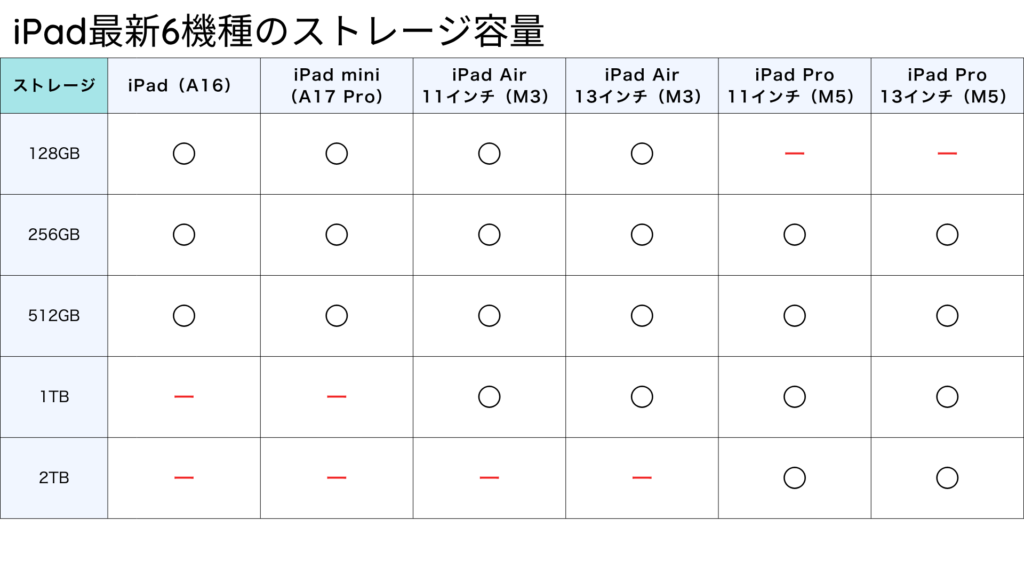 iPad Airは1TBモデルが追加されており、iPad Proは128GBがない代わりにさらに2TBが追加されています。