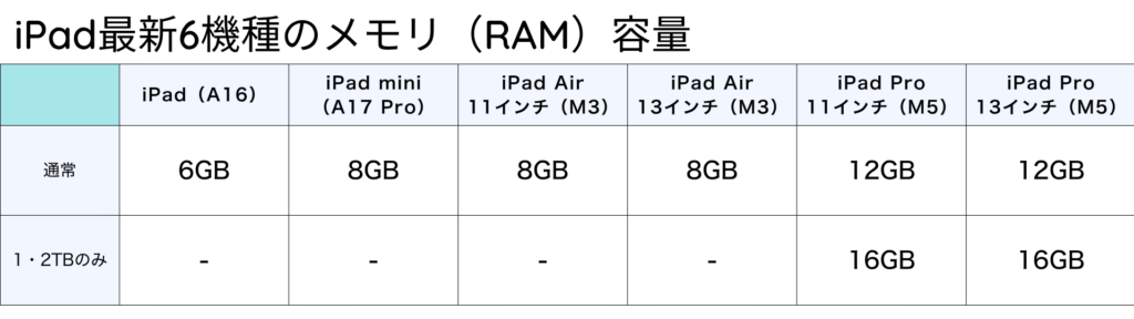 iPad mini(A17 Pro)とiPad Air(M3)では8GB。