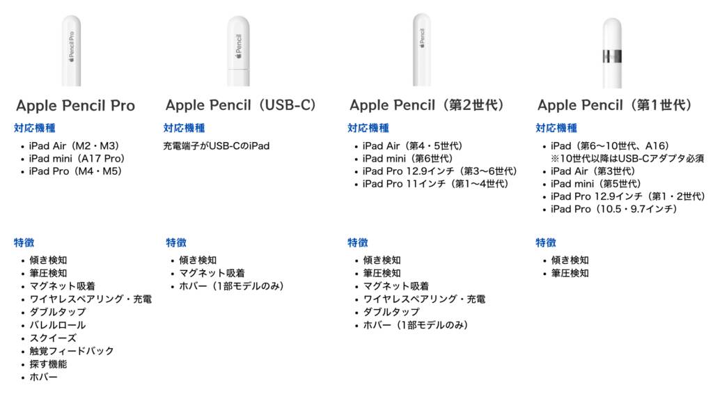 | 対応Apple Pencil | ・Apple Pencil(第1世代) ・Apple Pencil(USB-C) | ・Apple Pencil Pro ・Apple Pencil(USB-C) | ・Apple Pencil Pro ・Apple Pencil(USB-C) | ・Apple Pencil Pro ・Apple Pencil(USB-C) | ・Apple Pencil Pro ・Apple Pencil(USB-C) | ・Apple Pencil Pro ・Apple Pencil(USB-C) |