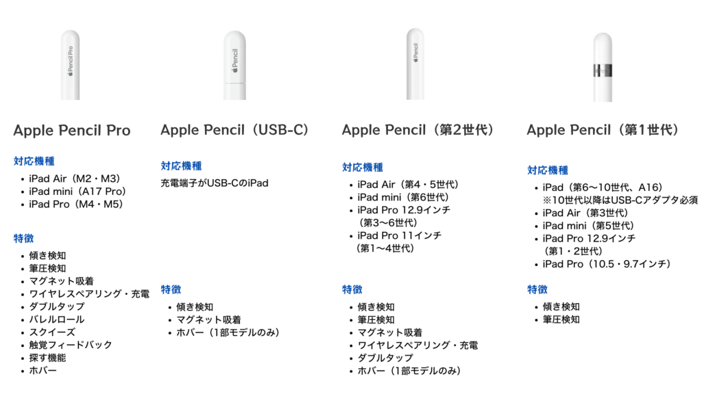| 対応Apple Pencil | ・Apple Pencil(第2世代) ・Apple Pencil(USB-C) | ・Apple Pencil Pro ・Apple Pencil(USB-C) | ・Apple Pencil(第2世代) ・Apple Pencil(USB-C) | ・Apple Pencil Pro ・Apple Pencil(USB-C) | ・Apple Pencil Pro ・Apple Pencil(USB-C) | ・Apple Pencil(第2世代) ・Apple Pencil(USB-C) |