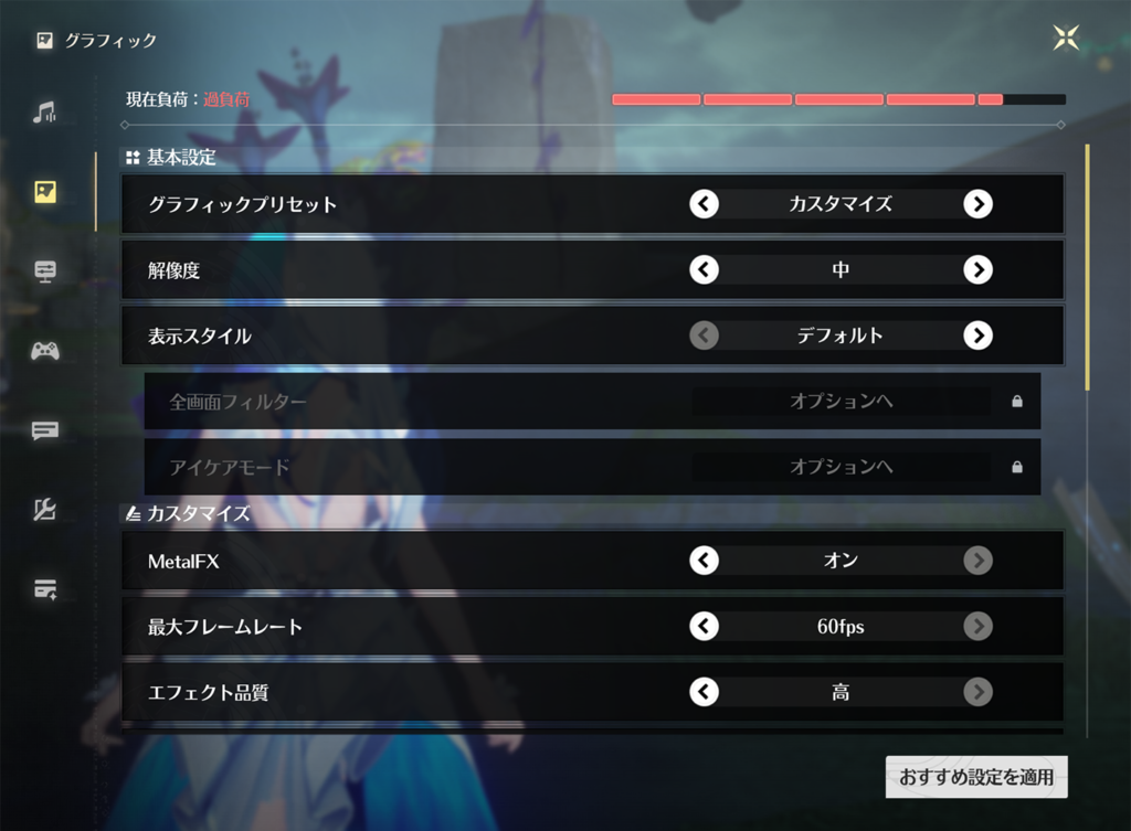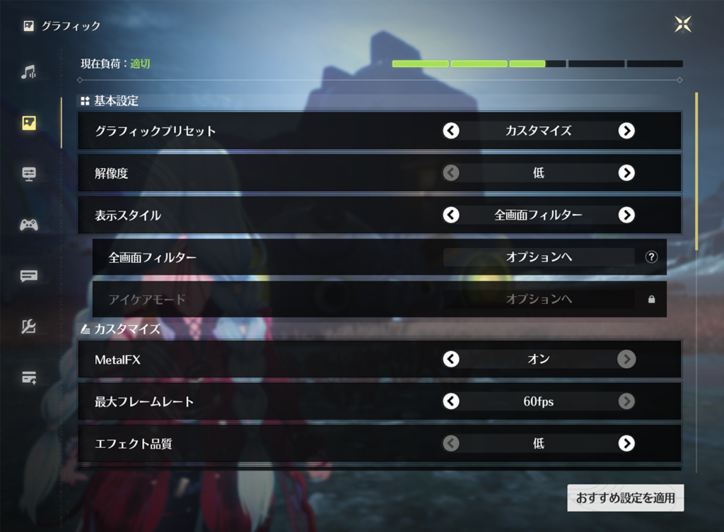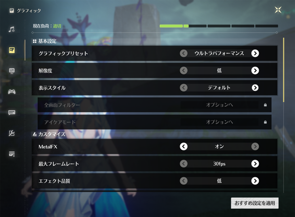 アップスケーリング(MetalFXなど)を設定できるならオンにしつつ、解像度は下げることで負荷を抑えつつ画質を上げられます。