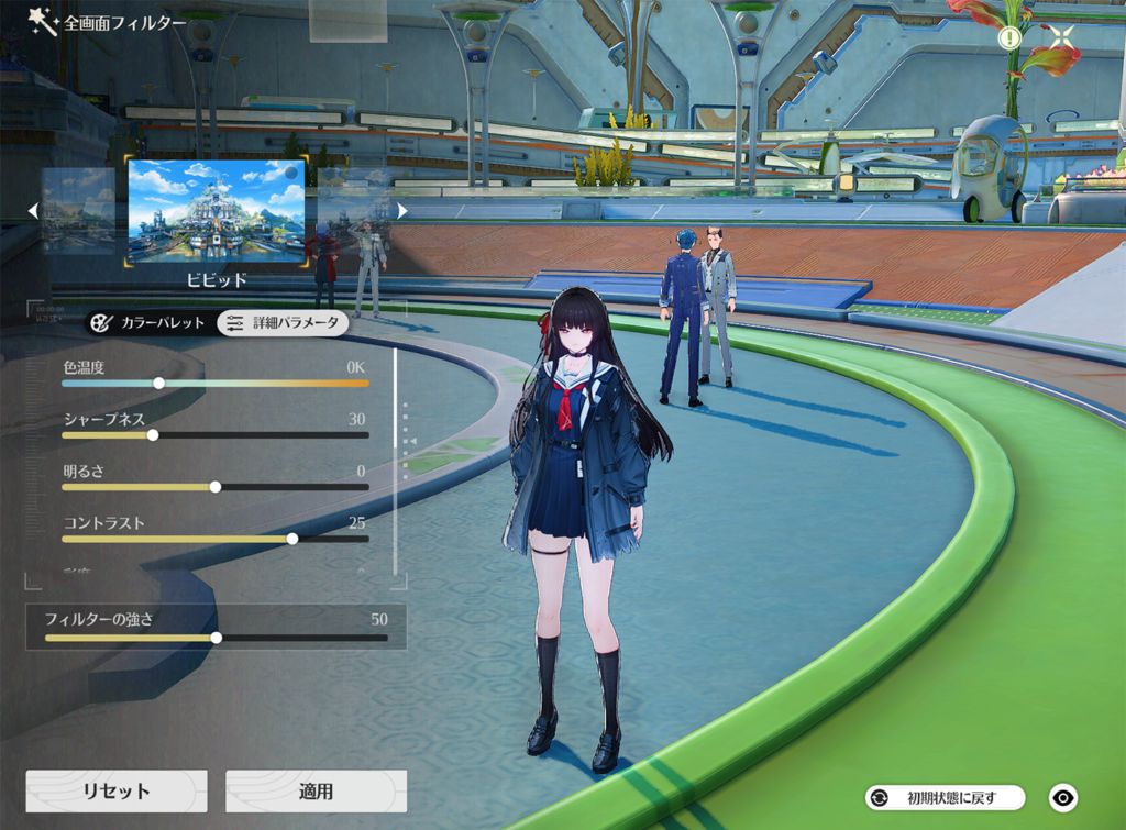 ビビッドは鳴潮の画面を鮮やかな色味にするフィルターで、影の陰影が濃くなり高級感のある画面となります。